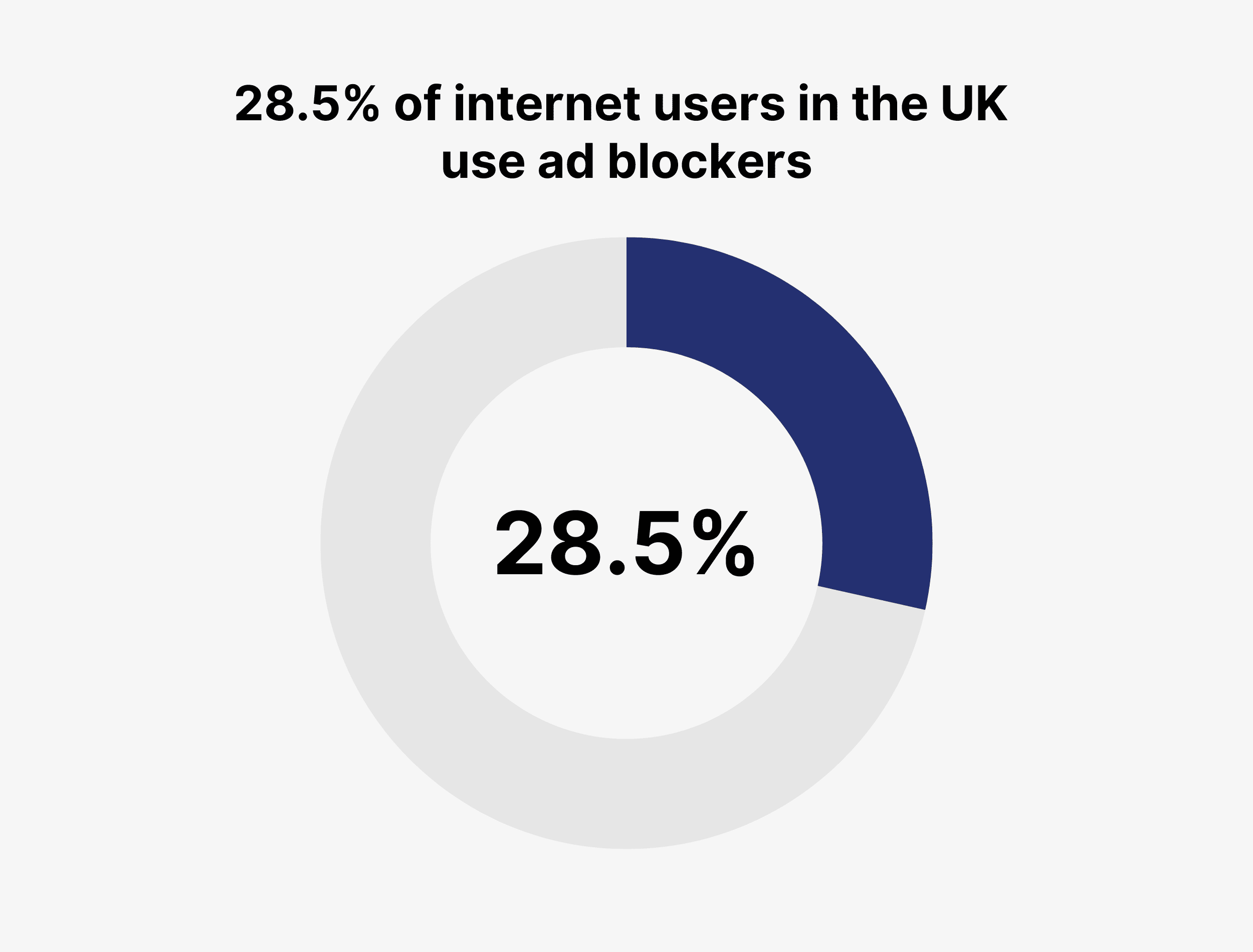 28.5% of internet users in the UK use ad blockers. The share of UK users utilizing ad blockers has been on a steady decline since 2016, when almost half (47%) of those surveyed admitted to blocking ads.
