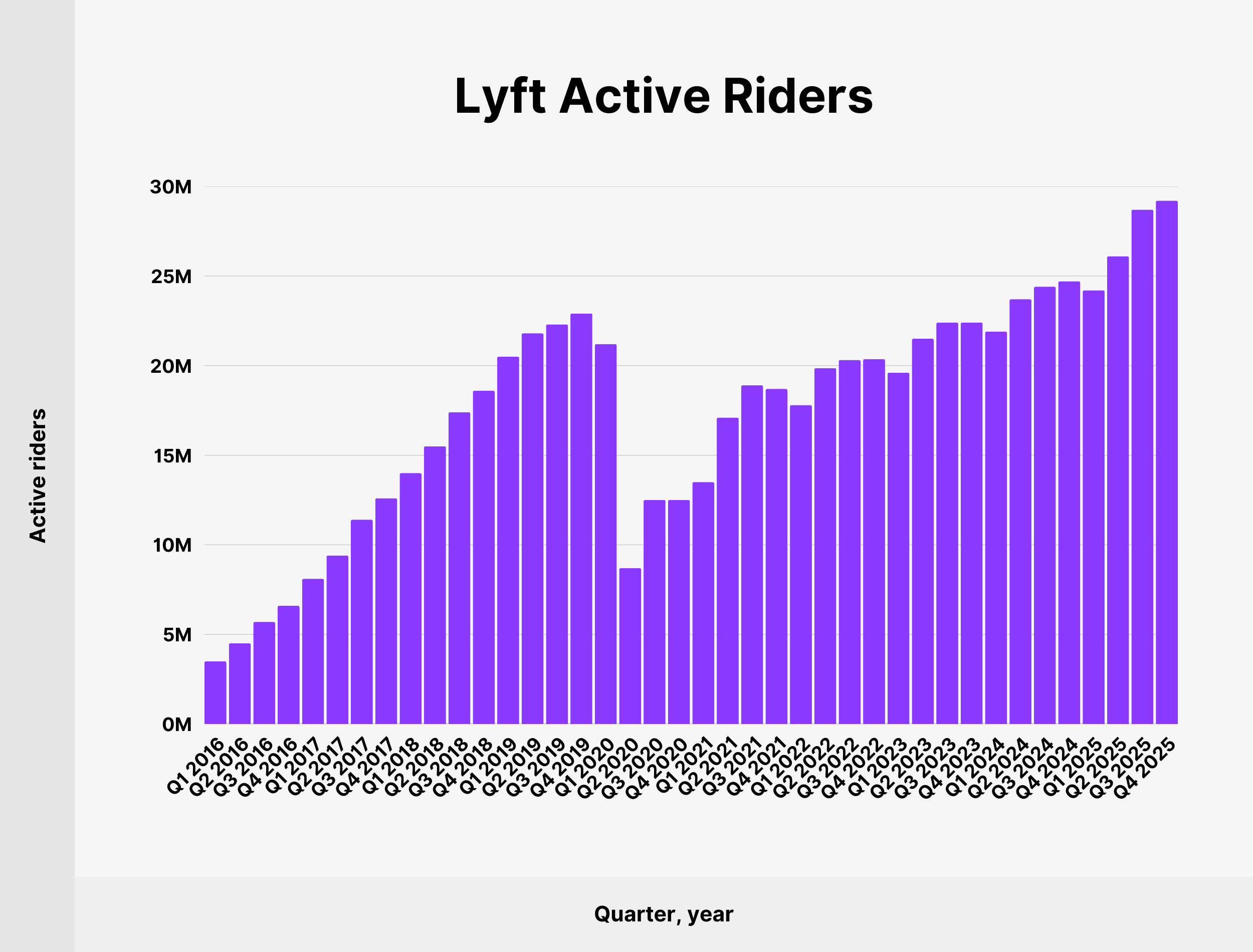 Lyft has 29.2 million active riders as of Q4 2025. Compared to the fourth quarter of 2024, Lyft’s rider count is up 18.22% (from 24.7 million).