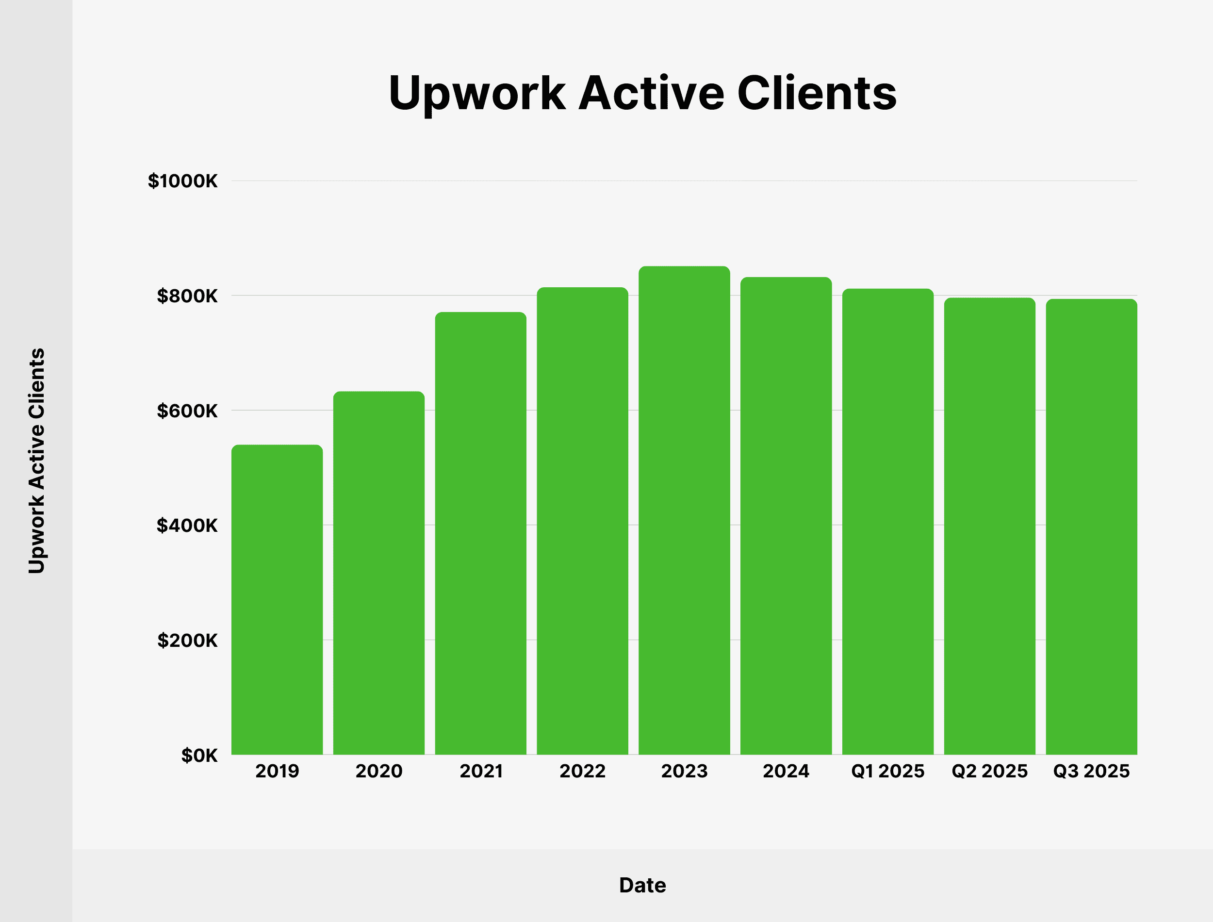 Upwork had 794,000 active clients in Q3 2025. That’s an 7% decrease from 855,000 in Q3 2024.