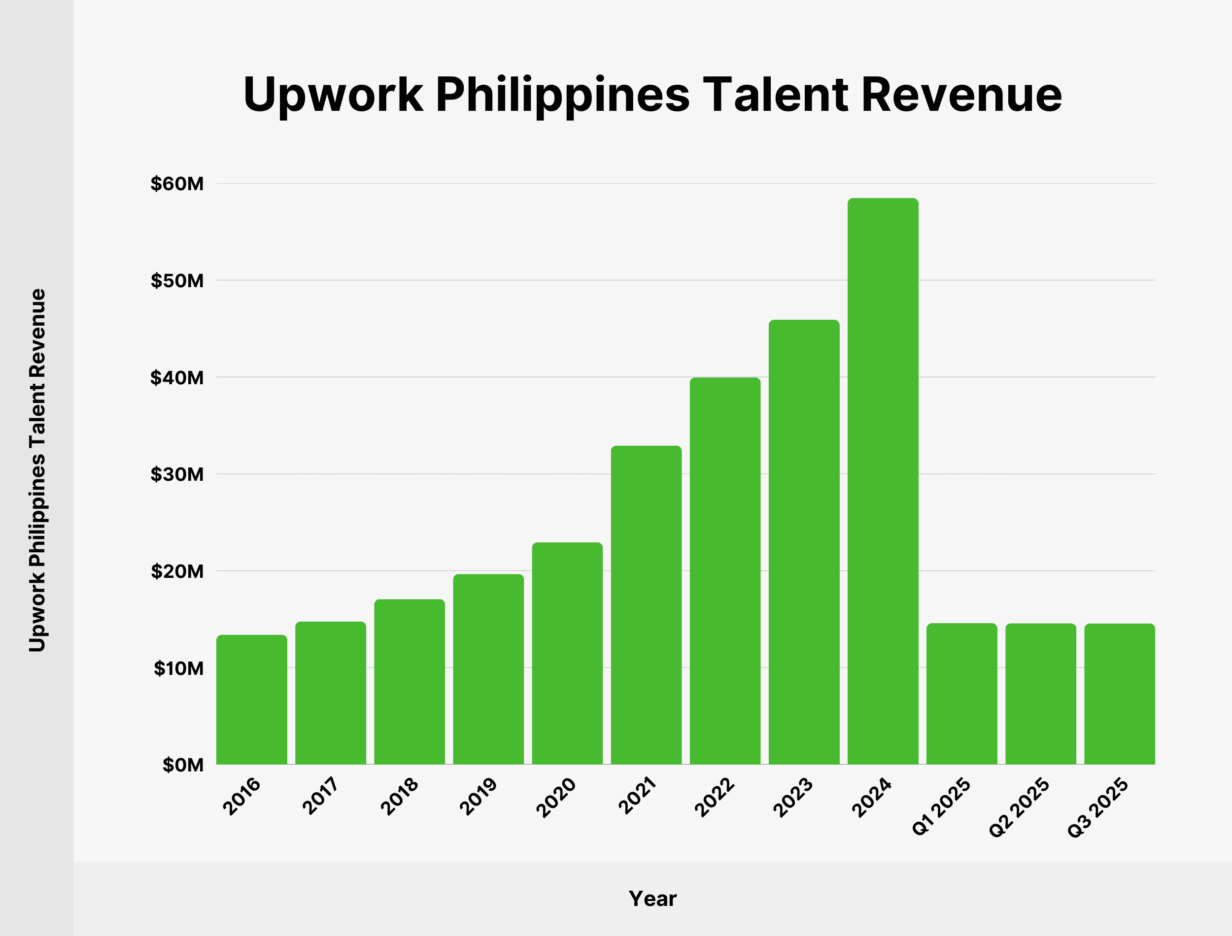 Here’s a table showing Upwork’s revenue from freelancers outside of the US, India, and the Philippines since 2016: